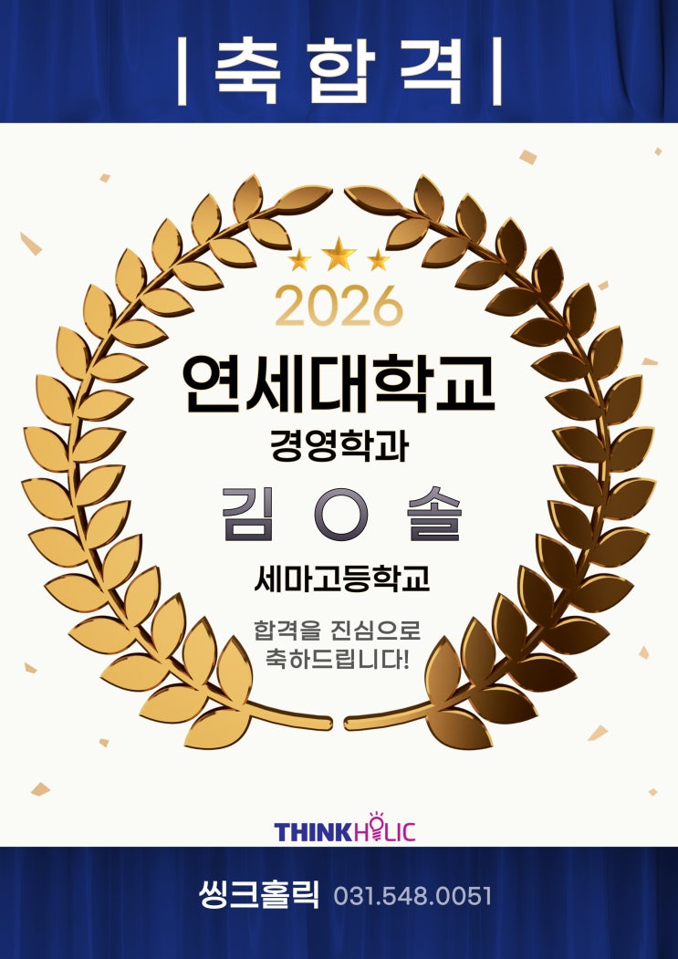 2026 연세대학교 합격생 : 김 ○ 솔 (세마고) [경영학과] 합격을 진심으로 축하합니다! " 원장님이 잘 챙겨주시고 잘 가르쳐 주신 덕분 ! " 이라며 반가운 소식을 전해준 우리 0솔이의 연세대학교 경영학과 합격을 축하합니다!!! 매사에 열심히, 항상 최선을 다해 공부하던 친구의 모습이 떠오릅니다. 이렇게 예쁜 학생을 씽크홀릭에 보내주셔서 감사한 마음이 들 정도로 모범적이었던 우리 0솔이의 즐겁고 행복한 대학 생활을 마음을 다해 응원합니다!! 더불어 더없이 기쁘고 행복한 소식을 전해주어서 정말 고마워요~♡ 친구가 가는 걸음걸음마다 행운과 축복이 가득하기를 기원합니다! 감사합니다!! <img src="https://blogthumb.pstatic.net/MjAyNjAyMTNfMjA3/MDAxNzcwOTY5OTc3NTQ2.iCPoVgkgzB_c6iZ8lILB69ARDB2z6mC4aadih8TA80Ug.hkdpzjPINXQJJrzqyEXoS4HmKfRSOL9Kx-feeYHe-zgg.JPEG/%B1%E8%BF%B9%BC%D6.jpg?type=s3" />