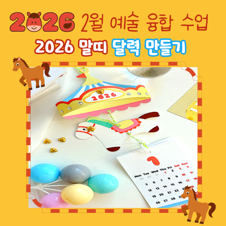 #2월예술융합수업 #포렛클래스 #음악특강수업 #목마달력만들기 #감성수업 #창의력수업 안녕하세요 우리 아이들에게 음악을 선물하는 나운 음악 나나 샘입니다 이번 달도 어김없이 우리 아이들과 특별한 예술 융합 수업을 진행했어요 2월 예술 융합 수업은 목마 달력 만들기 말과 연상되는 클래식 음악으로 신나고 경쾌한 윌리엄 텔 을 들으면서 빠르게 달리는 듯한 리듬에 맞춰 음악의 분위기를 느끼며 수업에 집중하였어요 또한 2026년 이루고 싶은 소원을 말해보는 시간도 가졌어요 놀이동산 가고 싶어요 피아노 잘 치고 싶어요 워터파크 놀러 가고 싶어요 각자 소원들은 다르지만 소망을 이루고 싶은 마음들은 다 같은 마음이겠죠? 그다음 목....... <img src="https://blogthumb.pstatic.net/MjAyNjAyMTRfNTkg/MDAxNzcxMDc4NjU5MzY3.Ju8d7his5fD_8O3_-EgNtmBAbmqDRalxT0jFw5s5SE0g.WvEifQfggeq3QF3yUfUBqptatcQ0JfzQKXcAnXyNaMIg.PNG/%C1%A6%B8%F1%C0%BB_%C0%D4%B7%C2%C7%D8%C1%D6%BC%BC%BF%E4.%A3%AD5.png?type=s3" />