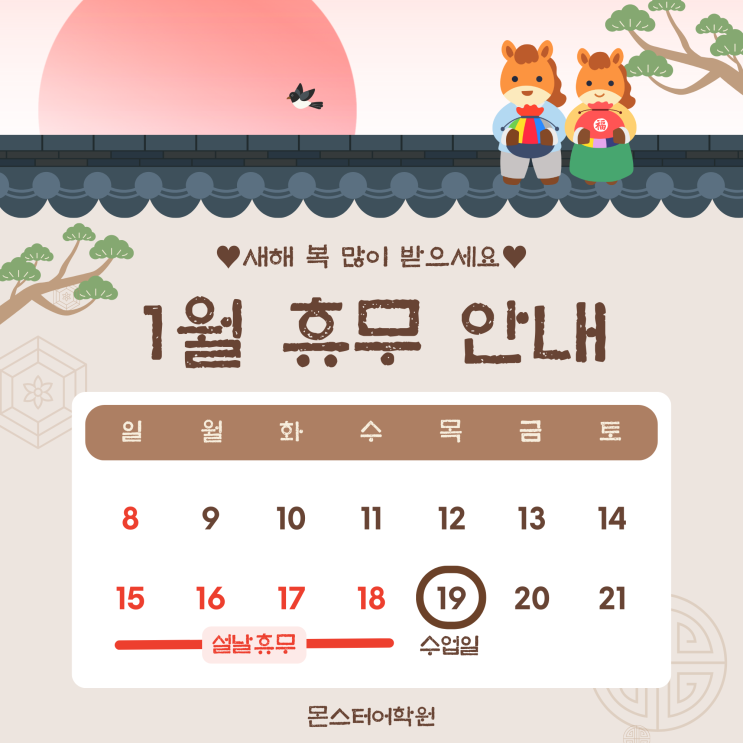 [몬스터어학원] 2026년 2월 설 연휴 휴원 안내