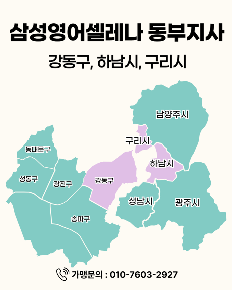 삼성영어셀레나 동부지사 강동·하남시·구리시 서울 동부 지역 영어학원 운영과 가맹 상담을 원하신다면 언제든지 연락주세요! #삼성영어셀레나북부지사 #삼성영어셀레나동부지사 #삼성영어셀레나강북구 #삼성영어셀레나도봉구 #삼성영어셀레나노원구 #삼성영어셀레나성북구 #삼성영어셀레나하남시 #삼성영어셀레나강동구 #삼성영어셀레나구리시 #영어학원가맹 #영어프랜차이즈가맹 #영어학원전환 #영어학원창업 위 지역의 가맹을 원하신다면 언제든지 010-7603-2927 로 연락주세요! <img src="https://blogthumb.pstatic.net/MjAyNjAxMzBfMjk0/MDAxNzY5NzYzMTg1MDU2.RZY2RdPvdns8o-7rkFqGoHrioCTdS9zsMZOCtdIArXwg.OOGkBaqfWxOesaDwspx2nWobBNYJNlaWcfwFC_1KJTcg.PNG/002.png?type=s3" />