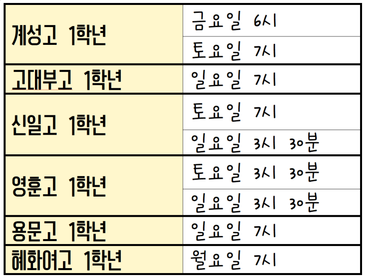 3월 시작을 목표로 예비고1 학교별 시간표를 조율하고 있습니다. 확정되는 대로 시간표를 업데이트할 예정입니다. 많은 관심 부탁드립니다. 아래는 2월 12일 현재 확정된 학교들이며 가나다순으로 배열했습니다. (계성고, 신일고, 영훈고는 두 개반으로 개설되어 있습니다. 이 점 참고 바랍니다.) <img src="https://blogthumb.pstatic.net/MjAyNjAyMTJfMTgz/MDAxNzcwOTA1OTI3NzI3.izslJPsCFGT7HupZ5xP1W8vhl2rfYykzGCwPkKsP06og.ZVGAv_SpWNb7x5zuv2yAMp1KmJiTzRjJqXTnWbf5PrQg.PNG/%BF%B9%BA%F1%B0%ED1_%BD%C3%B0%A3%C7%A5.png?type=s3" />