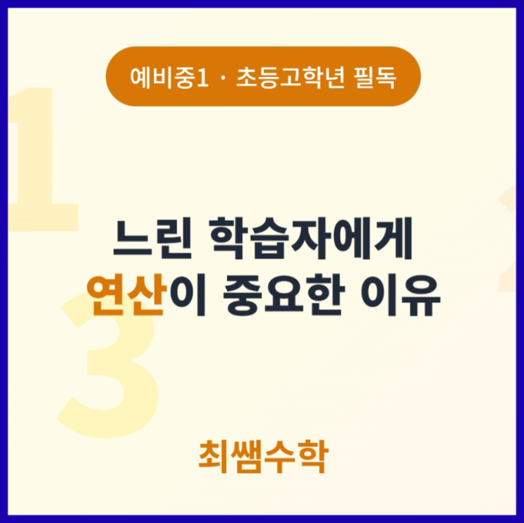 느린 학습자에게 연산이 중요한 이유 학부모 상담을 하다 보면 “개념이 먼저 아닌가요?”라는 질문을 많이 받습니다. 물론 개념은 중요합니다. 하지만 느린 학습자에게는 ‘연산 안정감’이 먼저입니다. 1️⃣ 계산이 느리면 사고가 끊깁니다 느린 학습자는 한 문제를 풀 때 머릿속에서 동시에 여러 과정을 처리해야 합니다. 문제 읽기 식 세우기 계산하기 답 검토하기 그런데 기초 연산이 자동화되지 않으면 계산 단계에서 이미 에너지를 다 써버립니다. 결과는? 문제 이해력이 떨어진 것처럼 보입니다. 실수가 많아집니다. “수학이 어려워요”라고 말하기 시작합니다. 2️⃣ 연산은 ‘속도’가 아니라 ‘안정감’입니다 연산....... <img src="https://blogthumb.pstatic.net/MjAyNjAyMTdfMTA5/MDAxNzcxMzE0NTc2NTUw.BUCQIMC2zOoBPMd-w_UT9_qfakmgegnB5JHm42Nevkkg.CGg_ntFZmLC4YPSHWmfVemUqGd1fbMADq0LHg9UTMvEg.PNG/900%A3%DF%C1%A6%B8%F1_%BE%F8%B4%C2_%B5%F0%C0%DA%C0%CE%A3%DF20260217%A3%DF164256%A3%DF0000.png?type=s3" />