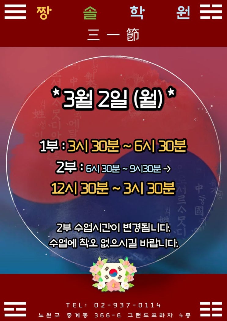 3/2(월) 1부 3:30~6:30 2부 6:30~9:30 -> 12:30~3:30 수업 시간 착오 없이 아이들 등원 부탁드립니다. <img src="https://blogthumb.pstatic.net/MjAyNjAyMjBfMjEw/MDAxNzcxNTg1MTkzNDc1.LsuSOue6EMu_FlkQaKgtwclzvnuqsitLa0929S0WgZMg.jKuGYKceQ7dq8HgCuxMk9WsJ3obR2ENR37k1lj1bcOAg.JPEG/%C1%A6%B8%F1%C0%BB_%C0%D4%B7%C2%C7%D8%C1%D6%BC%BC%BF%E4._%281%29.jpg?type=s3" />