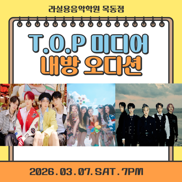 [26년 2월 오디션 정보]외부인 참가 가능틴탑,MCND,ODD YOUTH 소속 티오피 미디어 내방 오디션 소식! - 라실용음악학원 목동점 오디션반