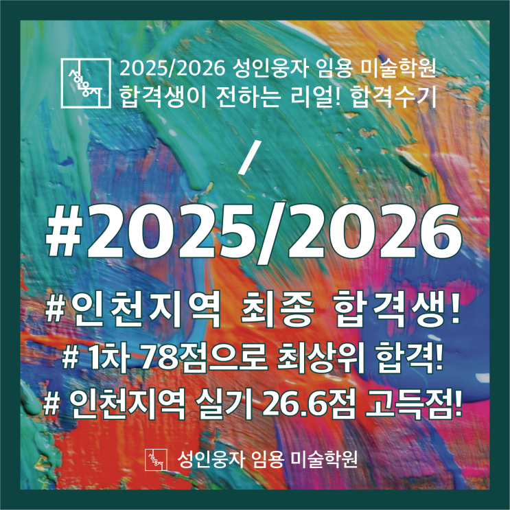 2026 미술 임용 인천지역 인체소묘 + 디자인과목 실기 26.6점! 최종 합격생 합격수기 + 합격작! 노량진 미술 임용 실기 전문학원 성인웅자 임용 미술학원입니다! 오늘은 유독 변별력이 높았던 2026 미술 임용 인천지역에서 인체소묘 + 디자인 실기로26.6점! 이라는 고득점으로 최종 합격을 하신 선생님의 합격수기와 디자인, 소묘 합격작을 소개합니다. 다른 해와 다르게, 이번 2026학년도의 인천지역은 선발인원이 늘어나며, 서울지역을 응시하시던 분들이 인천으로 방향을 돌리며 2차에서 변별력이 높았습니다! 2026학년도 미술임용 인천지역! - 티오가 늘어나며 지원자가 늘어남! - 경쟁률 7.4 :1 - 1차 합격 컷 72점으로 매우 높음! - 지원자....... <img src="https://blogthumb.pstatic.net/MjAyNjAyMjJfMTcz/MDAxNzcxNzQ2NjEwNDQ4.mszUUY-5UdysDy83bnhpMkz8uhwfNgde1fSOlKV7VzUg.G1IAomzNOY3oEVqfff6IwwnDcidW5akaSXYez18FlzUg.PNG/%B1%E800_%C7%D5%B0%DD%BC%F6%B1%E2_%B9%E8%B3%CA.png?type=s3" />