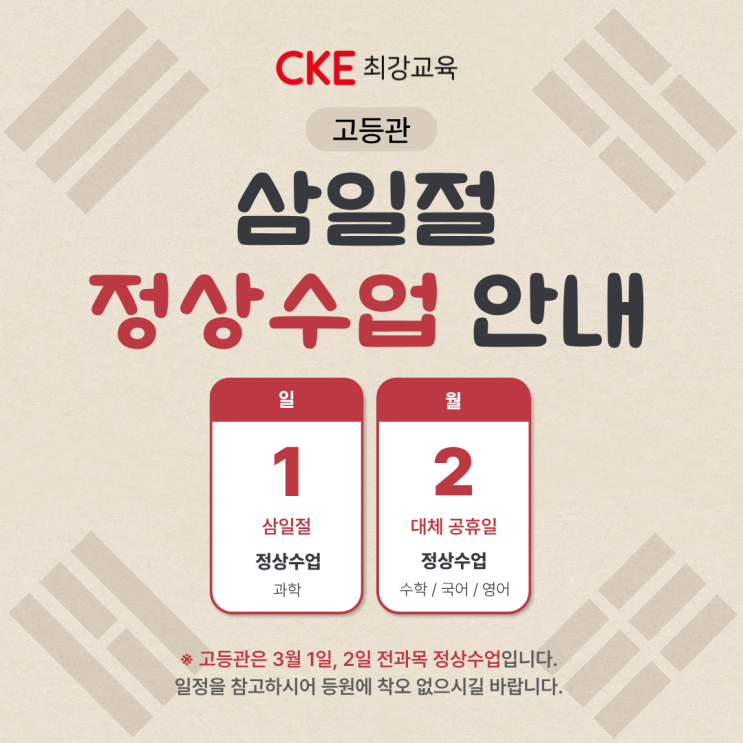 안녕하세요. 최강교육 고등관입니다. 다가오는 3월 1일 삼일절 및 대체공휴일에도 고등부(고1, 고2, 고3) 수업은 정상적으로 진행됩니다. 최강수학 / 최강국어 / 최강영어 / 최강과학 모든 수업이 변동 없이 정상 운영되오니 일정에 참고해 주시기 바랍니다. 감사합니다. 최강교육 고등관 | 상담문의 ☎ 02-823-8976 <img src="https://blogthumb.pstatic.net/MjAyNjAyMjNfMTM4/MDAxNzcxODI3MjYyMjMy.A96SS5_Uue0QJatK_KWdrao7xyQoYsPU46zKmS-uiaYg.E52P9hoATz-THz-IjKklZ69LLNqzsNNSukfP0cZY5SMg.PNG/%C1%A6%B8%F1%C0%BB_%C0%D4%B7%C2%C7%D8%C1%D6%BC%BC%BF%E4._%285%29.png?type=s3" />