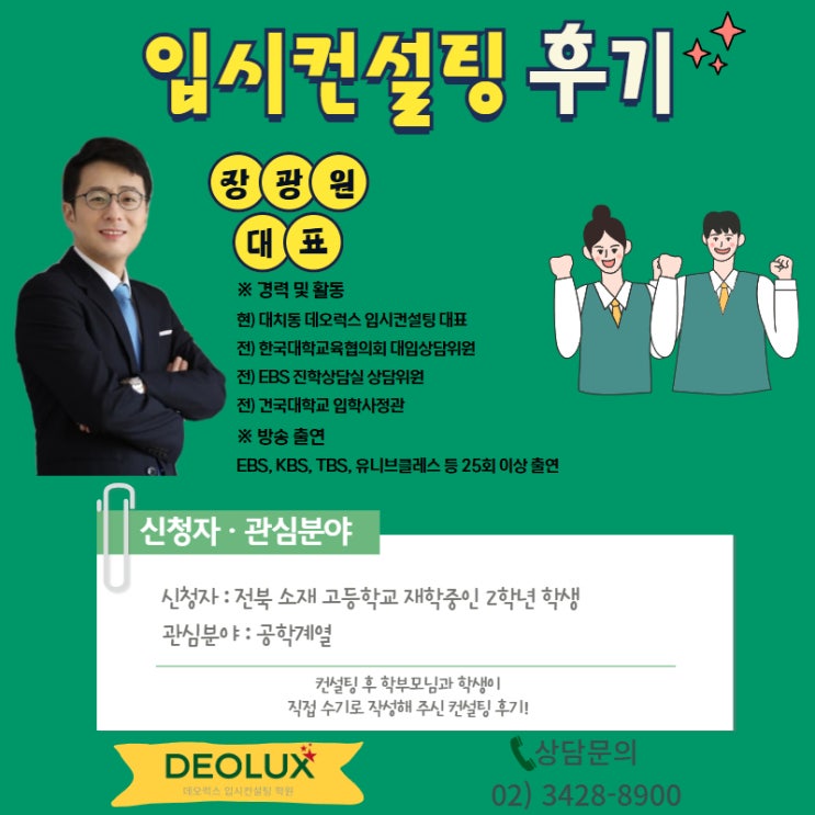 입학사정관 & EBS 진학상담위원 출신 학생부종합전형 컨설팅 전문 대치동 데오럭스 입시컨설팅입니다. 대치동 데오럭스 입시컨설팅 안녕하세요 학생부종합전형 컨설팅 전문 대치동 데오럭스 입시컨설팅입니다. 새 학년을 준비하는 시기가 되면, "이 선택이 맞는 걸까?" "지금 바꿔도 늦지 않을까" 같은 고민이 자연스럽게 따라옵니다. 특히 공학계열을 희망하는 학생들의 경우에는 과목 선택 하나하나가 전공 적합성과 직결되기 때문에 불안감이 더 커지기 마련인데요. 오늘은 이런 고민 속에서 상담을 진행한 전북 소재 고등학교 예비 고2 학생의 컨설팅 후기를 전해드리려 합니다. 지금 바로 보러가시죠....... <img src="https://blogthumb.pstatic.net/MjAyNjAyMTBfMzcg/MDAxNzcwNzAwNzI3ODQ5._r_KjfcRK1qCOvhRTpqDVqwW81yZdJAAQry-fh-Q-9gg.IWtnyiYBp5qbFBlEDJ1rap3l1MfZOddwK_oYl_5zBGUg.JPEG/2.10_16%BD%C3_%BB%F3%B4%E3.jpg?type=s3" />
