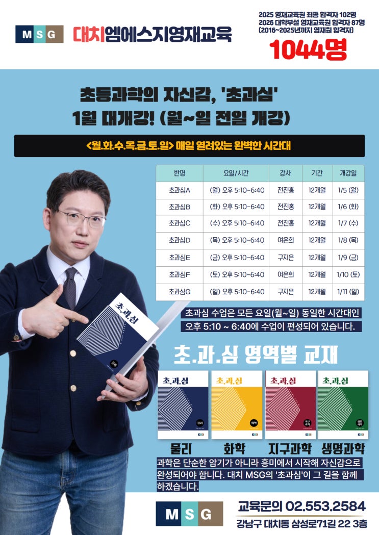 [대치 MSG 영재교육] 초등과학의 자신감, '초과심' 1월 대개강! (월~일 전일 개강)