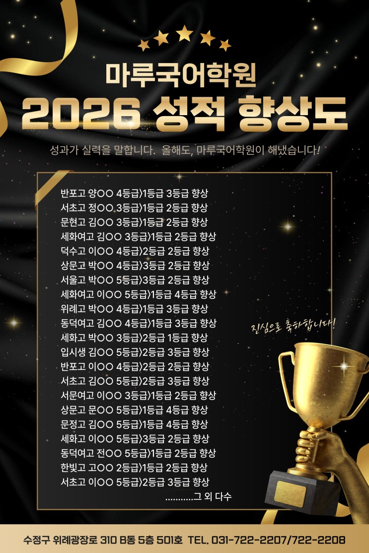 안녕하세요! 위례 마루국어학원입니다. 2026학년도 대학수학능력시험이 끝난 후, 마루국어학원에서는 재원생들을 대상으로 수능 채점 결과를 정리하였습니다. 마루국어학원의 체계적인 분석 수업과 개별 맞춤 지도를 통해 학생들은 충분히 좋은 결과를 만들어낼 수 있었습니다. 아래 이미지는 위례와 잠실 지점 재원생들의 실제 수능 국어 채점 결과를 기반으로 한 자료입니다. 마루국어학원은 운문문학 · 산문문학 · 비문학 · 어법 각 영역별로 학생 1인당 2명의 전문 교사진을 배정하는 체계적인 수업 시스템을 운영하고 있습니다. 이를 통해 학생 개개인의 강점과 취약점을 정확하게 진단하고 단순 보완이 아닌 맞춤형 밀착 관리 수업으로 연....... <img src="https://blogthumb.pstatic.net/MjAyNTEyMTdfMjIy/MDAxNzY1OTUzOTk2NjIx.p20fIkz6n4HRRLVo7eWmm4_Ye9xdaFSLsmXdVdpVZGwg.tfRLbd8zojS0BGtveHYLSZcZBIDTaYE59Zomw37QgiYg.JPEG/2026%BC%F6%B4%C9-001.jpg?type=s3" />