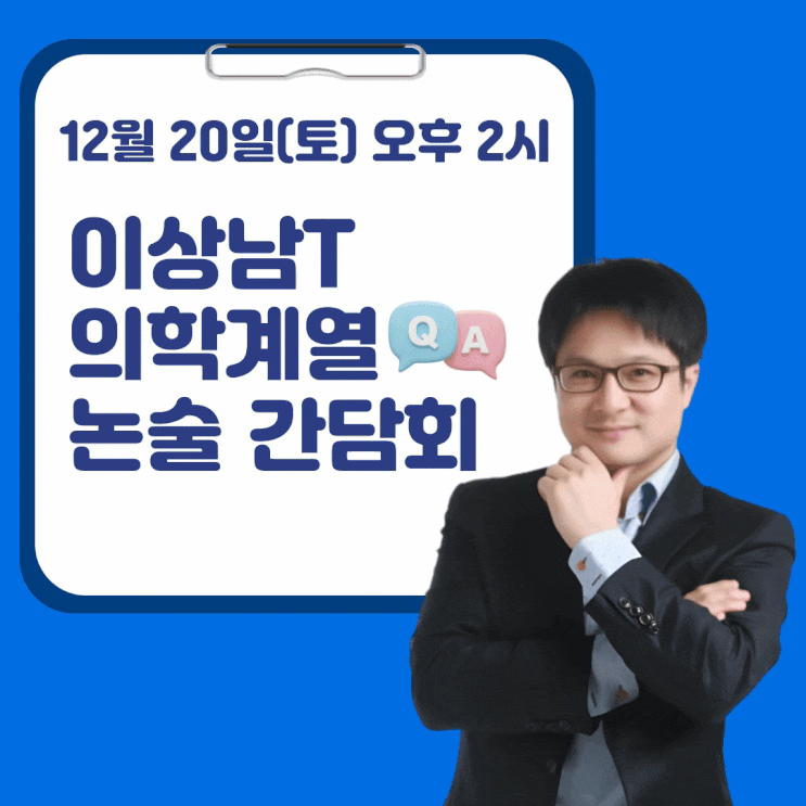 [미래탐구 논증과추론] <예비 고3> 이상남T 의학계열 논술 간담회 미래탐구 논증과추론의 의학계열 수리논술 전문 이상남 선생님과의 간담회 자리를 마련합니다. ★ 반드시 참석하실 학부모님, 학생만 예약해 주시기 바랍니다. ■ 간담회 일시 : 12월 20일(토) 오후2시 ★예약 신청☞ https://vo.la/XALpRW1 ■ 장소 : 미래탐구 논증과추론학원 2층 이상남T 포항공대 대학원 수학과 석사 졸업 미래탐구 논증과추론 수리논술 강사 의대 & 연세대 논술 정규반 및 팀수업 진행 _______________________________ [간담회 주요 주제] ● 2027학년도 의대 논술 대비 전략 ● 의예과 수리논술 대학별 출제 유형 분석 ● 어떤 학생들이 의대논....... <img src="https://blogthumb.pstatic.net/MjAyNTEyMTdfMjg2/MDAxNzY1OTcyNDIyODk0.4oA7VTMweQgEV2I5LKqCKhVJOGz-5Yt1y1WgVEtw_Nog._mtMQ1eMe63SnGqTKJn9NaBgSehf44NLNlG6i7xU8XUg.GIF/%C0%CC%BB%F3%B3%B2t-%B0%A3%B4%E3%C8%B8.gif?type=s3" />