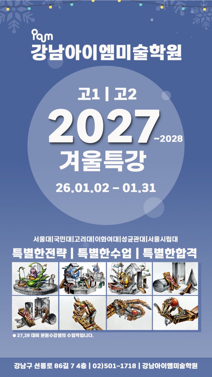 안녕하세요 강남아이엠미술학원입니다. 방학을 맞아 고1 고2 예비입시생들을 위한 겨울 특강이 시작됩니다. 실기력이 한단계 올라설 수있는 중요한 시기이기에 강남아이앰 마술학원도 야심차게 수업준비에 몰두 하고 있답니다. ^^ 고2학생들은 고3에 준하는 실기력 상승을 목표로 수시,정시를 위한 수업이 진행됩니다. 또한 고1학생들은 2028년 변화되는 입시의 방향에 맞는 컨설팅과 기초실기교육이 진행됩니다. 합격상담 02) 501-1718 <img src="https://blogthumb.pstatic.net/MjAyNTEyMThfMjkw/MDAxNzY1OTg2OTgwMjk4.EtCGGmhBdvf1qiCQWykMWAuqH0j3ORrYcypkk4ZPhCgg.zHeStKkQGkpbhJo5eKPZpiymlEu1LW398jDgz9r64I0g.JPEG/%B1%A4%B0%ED%C6%E4%C0%CC%C1%F61_%BA%B9%BB%E7%BA%BB.jpg?type=s3" />