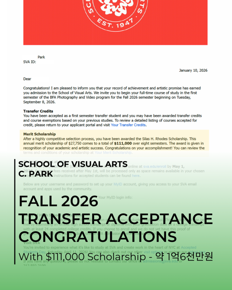[미국미술유학/뉴욕미술유학] 사진유학 비전공자 SVA 편입 합격 및 장학금 최대 $111,000 (약 1억 6천만원)!