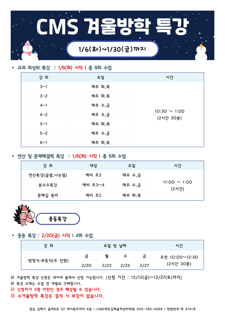 안녕하세요 CMS김해율하센터입니다 <겨울방학 특강 안내> ① 신청 기간 : ~12/27(토)까지 ② 신청 대상 : 재원생, 비재원생 모두 가능! ※ 중등특강은 비재원생이 신청할 수 없습니다. ③ 신청 링크 특강을 원하시는 학부모님께서는 신청 폼을 작성해주시길 바랍니다~ CMS에듀김해율하센터학원 l 학원등록번호 : 제 3741호 <img src="https://blogthumb.pstatic.net/MjAyNTEyMTJfMjQ1/MDAxNzY1NTMzMzE2ODc4.mz-LoWhX8a703oePJvASe1umyTT3uBFwBSCMGRobxAAg.Q74npshl1E0DB1pPNDIiuRvd-0Ke8Dz8ig_YVRXXL5sg.PNG/%B0%DC%BF%EF%B9%E6%C7%D0%C6%AF%B0%AD_1.png?type=s3" />