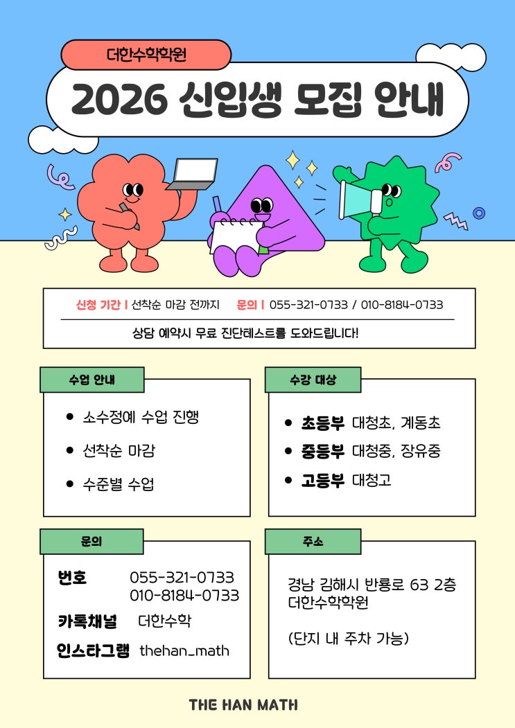 안녕하세요 더한수학학원입니다. 현재 2026 신입생 모집이 진행 중입니다! 더한수학은 소수정예 수업으로 운영되며, 아이 한 명 한 명의 이해도와 학습 흐름을 꼼꼼하게 확인하는 밀착 관리 수업을 가장 중요하게 생각합니다. 단순히 진도만 빠르게 나가는 수업이 아니라, 개념 이해 → 문제 적용 → 약점 보완까지 이어지는 체계적인 학습으로 학생 개개인의 실력을 차근차근 완성해나가고 있습니다. 현재 모집 중인 반들은 이미 선행 학습이 진행 중이며, 반별 정원에 맞춰 잔여 티오가 제한적으로 남아 있는 상황입니다. 수업의 흐름과 학습 효과를 위해 정원 충원 시 모집이 마감되므로, 입학을 고민 중이시라면 빠른 상담을 추천드립니다! 모....... <img src="https://blogthumb.pstatic.net/MjAyNTEyMTdfMTI0/MDAxNzY1OTY0NzcwOTg1.mYyBfmF7gxP5hqFGUoJlmVPScqSWG8x3MPrmLnkEbOIg.q1qsPgjNoGOrWVbJd8euPgLlgJDPZtgi8FzBlUkjHlcg.JPEG/001.jpg?type=s3" />