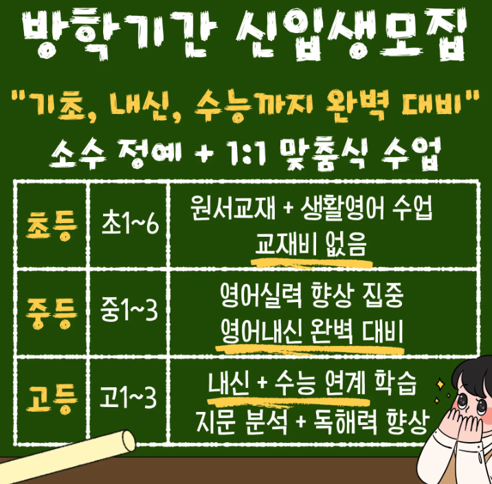 안녕하세요~ 멘토링영어의 차쌤입니다! 차쌤을 소개합니다! 겨울방학! 영어 실력을 확실히 올릴 시간입니다 겨울방학은 ✔ 학기 중 부족했던 영어를 정리하고 ✔ 다음 학년을 미리 준비할 수 있는 가장 중요한 영어 학습 기간입니다. 멘토링영어는 이번 겨울방학 동안 초등, 중등,고등 학생들의 영어 실력을 단계별로 끌어올리는 집중 수업을 진행합니다. [초등학생 겨울방학 수업] 영어의 ‘기초 체력’을 만드는 시간 ✔ 파닉스·발음 기본 점검 ✔ 생활영어 표현 + 원서 중심 수업 ✔ 듣기,말하기,읽기 기초 균형 학습 ✔ 복습 중심 수업으로 영어 학습 습관 형성 영어를 어렵지 않게, 꾸준히 할 수 있는 힘을 만듭니다. [중학생 겨울방학....... <img src="https://blogthumb.pstatic.net/MjAyNTEyMTlfMTU4/MDAxNzY2MTMyNDg3MjQ4._HFdfxcMeywpbPaM61HoimiqwlGE-eg5Tr-Jj2sKRgAg.Nwp9rh3g31WLrNlFRjjQxgJwlzC17XTEEONY4qoCh54g.PNG/%B9%E6%C7%D0%B1%E2%B0%A3_%B8%F0%C1%FD%BB%E7%C1%F8.png?type=s3" />