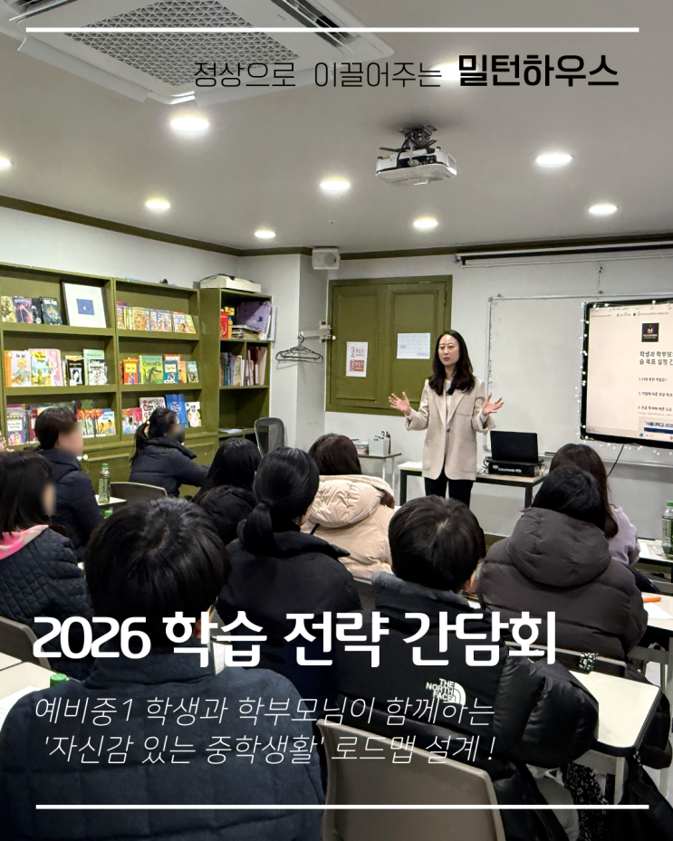 밀턴 중1학생들과 학부모님을 모시고 '2026년 학습 목표와 전략'을 함께 고민해보는 뜻깊은 시간을 가졌습니다 ! 중학생활 동안 꼭 만들고 싶은 좋은 생활태도는 무엇인가요 ? 내가 가장 자신있는 과목과 그 이유는 ? 중학생활에서 꼭 지키고 싶은 인간관계 원칙은 무엇인가요 ? 중학교 때 꼭 만들고싶은 독서 습관은 ? 우리 학생들은 스스로 중학교 학습 목표를 설정해보며 앞으로의 공부 습관과 태도에 대해 생각해볼 수 있는 시간이었고 부모님과 함께해서 더욱 좋았다는 후기를 들려주었습니다 ^^ 양일간 진행된 간담회에 적극 참석해주신 우리 학부모님들께 진심으로 감사드리며 앞으로도 학원과 가정이 우리 아이들의 성장을 위....... <img src="https://blogthumb.pstatic.net/MjAyNTEyMTlfNDIg/MDAxNzY2MTA3NDA5OTUx.holT169IfnTjC0AsNKsgREO8n6cqp8rL0zqkFM-EBpkg.XmGo1cfM_3OHd8Xa3YpmC0-LOmwCOB_ki--KtabMLIcg.PNG/%C1%A6%B8%F1%C0%BB-%C0%D4%B7%C2%C7%D8%C1%D6%BC%BC%BF%E4_-001_%2821%29.png?type=s3" />