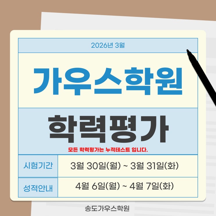 안녕하세요, 송도가우스학원입니다. 3월, 학생들이 그동안 배운 내용을 얼마나 잘 소화했는지 점검하고, 앞으로의 학습 방향을 설정하기 위해 3월 학력평가를 시행합니다. 가우스학원의 모든 학력평가는 그동안의 학습 내용을 꼼꼼히 체크하는 '누적테스트' 로 진행됩니다. ■ 시험 기간: 3월 30일(월) ~ 3월 31일(화) ■ 성적 안내: 4월 6일(월) ~ 4월 7일(화) 감사합니다. <img src="https://blogthumb.pstatic.net/MjAyNjAzMThfNDkg/MDAxNzczODEwMjc5NDkx.hoBgRErDxDlZc35fR9Yy9sw5rK6FYapYtoAV_Z-kwcEg.EDZr2hXd9Fr8LCLx8iF-wmYj8iopgsQQo8SVimbM09Yg.JPEG/3%BF%F9%C7%D0%B7%C2%C6%F2%B0%A1.jpg?type=s3" />