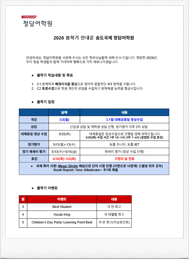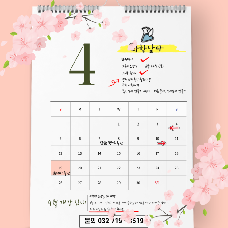송도과학학원 과학날다 4월 소식지 안내 안녕하세요. 송도에서 초등·중등 과학을 전문으로 지도하는 과학날다 양파쌤입니다. 따뜻한 봄과 함께 4월이 시작되었습니다. 아이들의 학습 흐름을 안정적으로 이어가고, 과학에 대한 흥미와 실력을 함께 키워갈 수 있도록 이번 달 주요 내용을 안내드립니다. 4월 학원 일정 안내 좋은 습관 만들기 이벤트 ( 중학생 10주 무결석 챌린지 중, 초등 바른글씨, 인사 습관 만들기) 탐구 노트 정리를 배우는 핵심 기간 창의 산출물 (보고서) 수상자 발표 중등 시험 대비 시작 과학원데이 4월 학원 일정 안내 4월 수업은 안내드린 4월 달력 기준으로 진행됩니다. 공휴일 및 일부 일정 변동....... <img src="https://blogthumb.pstatic.net/MjAyNjA0MDNfMTQ1/MDAxNzc1MTk5OTg4NzQ2.gURpOZ3VwC3_VRc8ZbiyAdiuRFrx3OYoU_k7p74wo5Qg.F1vXyhsxKhGqyS6itE93ceMSOPHuKUfOhsdDBHuqwS4g.PNG/4%BF%F9_%B4%DE%B7%C2.png?type=s3" />