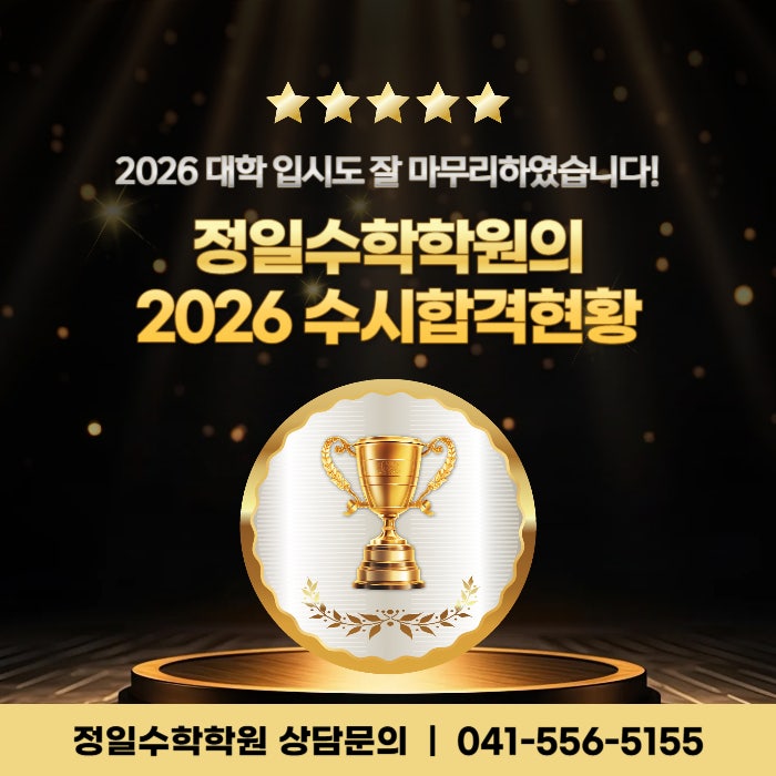 대치동 수학 강의를 천안에서도! 안녕하세요! 천안 서북구 두정동에 위치한 정일수학학원입니다. 올해도 정일수학학원에서는 의미 있는 소식을 전해드릴 수 있게 되었는데요, 학생들과 함께 쌓아 온 시간들이 좋은 성과로 이어져 저마다의 목표에 맞게 대학을 진학하게 되었죠. 지금까지 그 과정을 묵묵히 걸어온 학생들의 노력에 큰 박수를 보내며, 오늘은 2026학년도 수시 합격 현황을 자세히 알아보도록 해요! 정일수학학원 2026 수시 합격 현황 2026학년도 수시 전형에서 한양대, 경희대, 동국대, 세종대 합격이라는 놀라운 결과가 나왔습니다. 수시 전형은 고등학교 1학년부터의 성적 관리와 학습 태도가 함께 평가되는 구조이기 때문에, 단....... <img src="https://blogthumb.pstatic.net/MjAyNjAyMjVfMTYw/MDAxNzcxOTk3NTA5NjQ4.yBdbzwqbcxLHCF2lcgLOT6EDMazCN2Df_UfJcsNSExYg.nGV5lAFvOFxEmLDD2a2LvjsU7u_mBLEhr_DltAZNfmMg.JPEG/%B5%CE%C1%A4%B5%BF%BC%F6%C7%D0%C7%D0%BF%F8_%C7%D1%BE%E7%B4%EB%26nbsp%3B%B0%E6%C8%F1%B4%EB%26nbsp%3B%B5%BF%B1%B9%B4%EB%26nbsp%3B%BC%BC%C1%BE%B4%EB_%281%29.jpg?type=s3" />