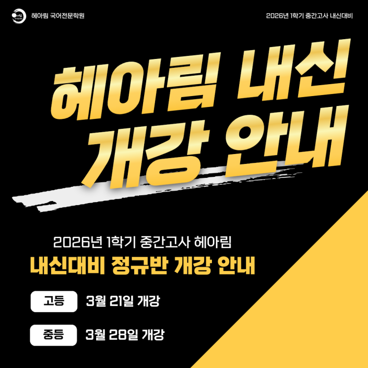 벌써 설날이 지나고 새학기를 맞이할 때가 찾아왔습니다ㅠㅠ 학생 학부모 여러분께서 새학기 첫 시험부터 어떻게 공부해야 할지 고민이 많으실텐데요~ 그래서! 저희 헤아림 국어학원이 2026 1학기 중간고사 대비를 위한 내신대비 정규반 개강 공지를 안내해드리겠습니다~~~ 고등부 3월 21일 | 중등부 3월 28일 1. 중등부 ※ 중등팀 두 분의 선생님이 함께 하십니다. ※ 학교 일정과 학생들 시간에 따라 변경될 수 있습니다. 2. 고등부 1학년 ※ 고1팀 두 분의 선생님이 함께 하십니다. ※ 학교 일정과 학생들 시간에 따라 변경될 수 있습니다. (작전고, 부평여고 시간 조율 중) 3. 고등부 2학년 ※ 고2팀 두 분의 선생님이 함께 하십니다. ※ 학....... <img src="https://blogthumb.pstatic.net/MjAyNjAyMTlfMjAx/MDAxNzcxNDgzMTcyMTYz.DYCiXXlJ-0gzK_bcUWAXu8ZVB_HdNxZJxJGhCB9lcHIg.1CxA5f3Bhq2VKJ48LB7mNyUHRJgRfe9c9kATPQHHhwsg.PNG/%BA%ED%B7%CE%B1%D7_%B0%D4%BD%C3%B9%B0-2.png?type=s3" />