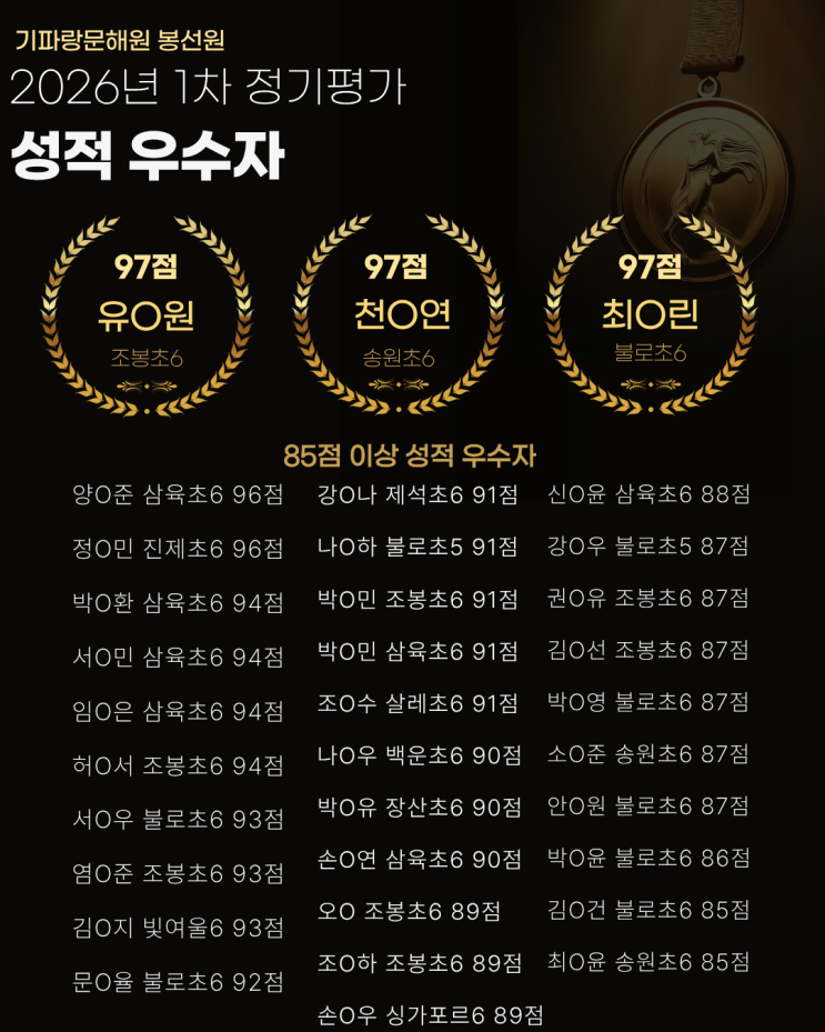 봉선동 국어학원 기파랑문해원 초등부 1차 정기평가 성적 우수자
