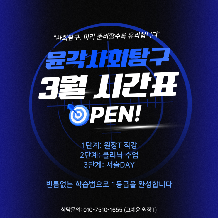 윤각사회탐구 26년 3월 정규반 시간표 안내 안녕하세요! 사회탐구 1등급을 현실로! 광주 봉선동 윤각사회 탐구입니다. 이제 날씨가 조금씩 풀리면서 봄이 다가오고 있죠 설렘반 긴장감반으로 곧 다가오는 새학기를 맞이하고 계실 것 같은데요! "이번 학기에는 꼭 원하는 등급을 달성할 거야!" 다짐하고 계신가요? 하지만 마음만 먹고 실천이 없으면 원하는 결과를 얻기 힘들죠. "시험 전에 벼락치기로 하면 돼" "아직 중간고사까지 여유있어" 이렇게 안일하게 생각하다보면 어느새 3월이 다가오고 새학기에 적응하느라 시간을 훌쩍 지나갈 것입니다. 그리고 곧 중간고사는 코앞으로 다가와 있겠죠. 사회탐....... <img src="https://blogthumb.pstatic.net/MjAyNjAyMjRfMjk0/MDAxNzcxOTI0NDE5NTUw.08-P7AMbd57tlIAySQPss_T5rrRvV8Gkp5srylLQ8Pgg.z2ZjdGyDRXkSGGPVTOUFcHE-FTyimnigL9IaUMumWHAg.PNG/%C0%B1%B0%A2%BB%E7%C8%B8%C5%BD%B1%B8-0.png?type=s3" />