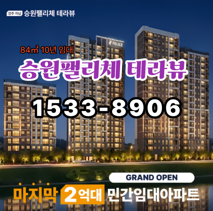 ☎방문예약 및 상담안내☎ 1533-8906 ♥온라인 방문예약♥ 개요 공급형태: 10년 장기 민간임대 아파트 시행·시공: 승원건설그룹 브랜드 (FELICE 의미: 행복) 위치: 광주광역시 광산구 임곡동 하남지구 생활권 규모: 3개동, 지하 1층 ~ 지상 20층 총 162세대 면적: 84㎡ 단일 평형 (전용면적 기준) 위치 임대보증금: 34평형 기준 약 2억대 중후반 수준 (2억 초중반 전세대) 계약금 500만원으로 입주 가능 (잔금 부담 ↓) 입주 시 최대 90% 보증금 대출 가능 (금융 지원) HUG 보증 가입으로 보증금 반환 리스크 차단 취득·재산세·종부세 없음 → 세금 부담 없음 단지배치도 전 세대 오픈 테라스 적용 단독주택 감성 + 아파트 편리성 결합 4Bay-4Roo....... <img src="https://blogthumb.pstatic.net/MjAyNjAyMTFfODgg/MDAxNzcwNzk2MzQxMzcy.K2PXn-0vUv4zN_ZkRmFWUUhpyIGKWZT_Yaoz-mekEH4g.5xfFniXCw8ORy1E0weaVLKKq3bsZgDTRRqRF6tbo2qUg.PNG/%B4%EB%C7%A53.png?type=s3" />