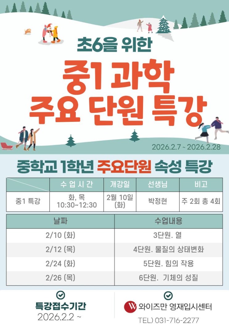 안녕하세요!! [와이즈만 영재입시센터 분당] 입니다 !! 초등학교 6학년을 위한 중학교 과학 선행 특강 OPEN! 중학교에 올라가면 과학은 암기 과목이 아니라 이해 과목으로 바뀝니다. 특히 중1 과학은 이후 물리·화학 개념의 기초가 되는 매우 중요한 시기입니다. 그래서 이번에 초등학교 6학년 학생들을 대상으로 중학교 1학년 핵심 단원 선행 과학 특강을 준비했습니다! ★ 특강에서 배우는 내용 (중1 과학 핵심 4개 단원)★ 3단원 열 온도와 열의 차이 이해하기 열의 이동(전도, 대류, 복사) 쉽게 설명 일상 속 예시로 개념 완전 정복 4단원 물질의 상태 변화 고체·액체·기체의 특징 비교 녹음, 끓음, 응결 원리 이해 상태 변화 그래프까지 5단....... <img src="https://blogthumb.pstatic.net/MjAyNjAxMzFfMjY1/MDAxNzY5ODI5NDQ4NDA1.S6z5glcq8MBWtNSwZT-RvIqrNTod9C3YbwK2-2Llkzgg.pZ0i5fdRecUZSXRKGn7SscWGRWWjiqHiMIKJubvBDGwg.JPEG/%B3%BB%BD%C5%C5%BE%C6%BC%BE%EE_%C6%AF%B0%AD.jpg?type=s3" />