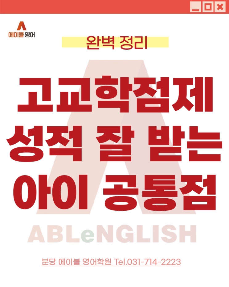 안녕하세요, 수능과 내신은 에이블이 답이다! 분당영어학원 에이블영어학원입니다. 고교학점제가 본격화되면서, 영어 성적을 두고 학부모님들의 질문이 달라졌습니다. “몇 점을 받아야 1등급인가요?” 가 아니라 “왜 시험은 잘 봤는데 성취도 A가 아닌가요? 라는 질문이 많아졌습니다. 정확한 고교학점제와 관련된 다양한 변화는 아래 게시글을 참고해 주세요, https://blog.naver.com/lovelovedd24/224157265763 이 변화의 핵심은 분명합니다. 고교학점제 영어는 더 이상 지필 점수 하나로 평가되지 않는다는 점입니다. 성취도 A를 받는 학생들은 시험 점수 이전에, 학습 방식부터 다릅니다. 그렇다면, 고교학점제에서 성취도 A를 받는 학생의....... <img src="https://blogthumb.pstatic.net/MjAyNjAyMDJfMTQ0/MDAxNzcwMDE5Njc4OTIz.Iel8PRef09LQzR6MSsy5benQn3ll2soXmJqAPzZnePcg.VxFWGid1C-FfPgVyHAooyBCHwMzLOK-ZmjbpsIBA2cUg.JPEG/%BF%A1%C0%CC%BA%ED2%BE%C6%C6%AE%BA%B8%B5%E5_20202.jpg?type=s3" />