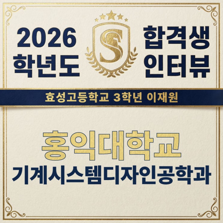 이재원 학생은 수리 논술 전형을 통해 홍익대 기계시스템디자인공학과에 합격한 학생입니다. 이재원 학생의 경우 고3까지 모의고사에서 수학이 계속 2등급이 나왔었는데, 수능에서는 결국 1등급을 받았습니다. 어떻게 수학 마무리 공부를 해서 결국 1등급을 받을 수 있었는지에 대해 자세히 이야기해 주었고, 수리 논술을 어떻게 준비했는지, 그리고 언제부터 준비하면 좋을지에 대해서도 잘 이야기해 주었습니다. 인터뷰에 참여해 준 이재원 학생에게 다시 한번 감사드립니다. <img src="https://blogthumb.pstatic.net/MjAyNjAyMDRfMTk1/MDAxNzcwMjAyODI2Njg0.mpgcsWTMZnVGF9pD4sMc3Z06qzdEr1SIOVxrf1rvXxEg.uv7w1CfmGAhilKVnJHeje0uUnavP73hObwW-QruQ_agg.JPEG/%C0%CC%C0%E7%BF%F8.jpg?type=s3" />