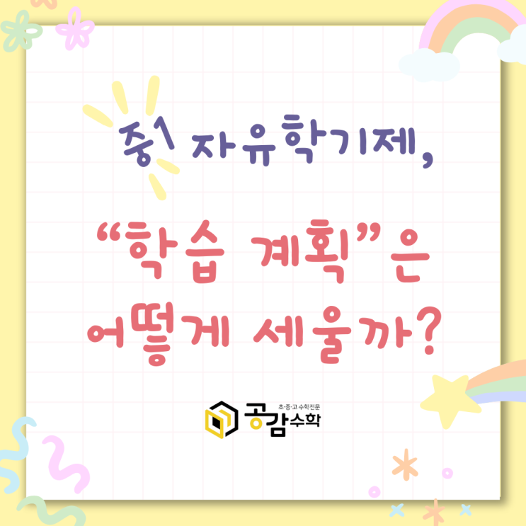 고산중등수학학원 중1 자유학기제, 이렇게 준비해요! 안녕하세요, 공감쌤이에요! 오늘은 중1 자유학기제에 관해 이야기해 볼 건데요. 올해 중학교에 입학하는 예비중1 친구들은 대부분 첫 학기를 자유학기제로 보내게 되는데요. 자유학기제라고 하면 무엇이 생각나시나요? 시험이 없다는 것만 떠올리고 있지는 않나요? 물론 자유학기제에 시험이 없는 것은 맞지만, 그게 전부는 아니에요. 오늘 공감쌤과 자유학기제가 정확히 무엇인지, 어떻게 보내야 하는지 함께 얘기해봐요! 자유학기제란? 자유학기제는 중학교에서 한 학기를 진로탐색 및 자치활동 중심으로 운영하는 제도예요. 원래 자유학년제로 시행되다가 22개정 교육과정 이후 자유학기제....... <img src="https://blogthumb.pstatic.net/MjAyNjAyMTFfMTE3/MDAxNzcwNzg1NTg2MDQw.aakf7xzO1DJmtkSQOqI9G4QmPUdRxqprRQiMwUjYv3wg.qK_G8Ly8X6TGPL98EHUnCa7qgvuBPuW1MFrWQ_KI7tIg.PNG/1.png?type=s3" />