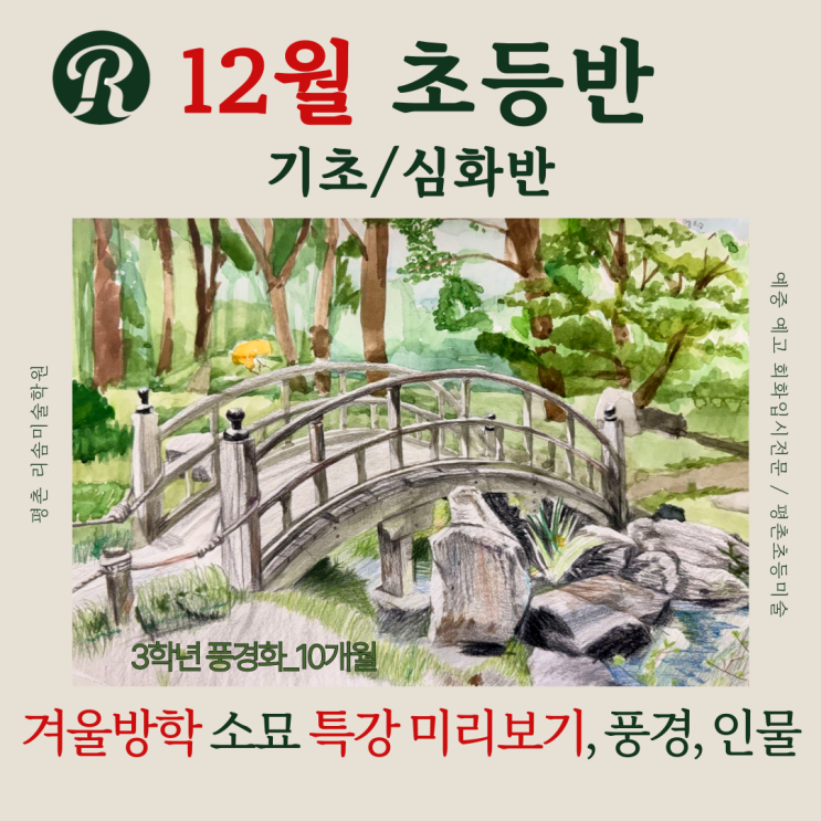 안녕하세요. 평촌초등미술 리솜미술학원입니다. 겨울방학기간이 시작되었습니다. 벌써 새 학년이 될 학생들이 모습이 기대됩니다. 새 학년에 올라가기 전 새로, 본격적으로 그림을 배우기 시작한 친구들의 그림들과 이번 달에 마무리된 그림(동물, 풍경, 인물, 정물)들, 1,2월에 본격적으로 시작될 겨울방학 수업인 기초 도형과 이론수업을 진행한 친구들의 그림을 함께 소개해 드리겠습니다. 새로 시작하는 학생들의 수업 포인트 리솜의 기초반에 처음으로 그림을 시작한 학생들의 초반 수업은 수업 적응과 함께 바른 자세와 알아야 할 이론과 단어들의 뜻을 알아가는 시간을 가집니다. 선생님의 설명을 이해하고 모르는 부분을 정확한 단어로 설....... <img src="https://blogthumb.pstatic.net/MjAyNTEyMDhfMTMx/MDAxNzY1MTk3MDA0MTMw.oDuzWrjLhG7PeLr1bWl2MXmI_BSqgd4ky9pSGK0goMIg.lqrSkns9bozbgOPvI4lu1v5IsEU13bWBorycOxPCvhIg.PNG/%3F%A0%9C%EB%AA%A9%EC%9D%84-%3F%9E%85%3F%A0%A5%3F%95%B4%EC%A3%BC%EC%84%B8%3F%9A%94_-001.png?type=s3" />