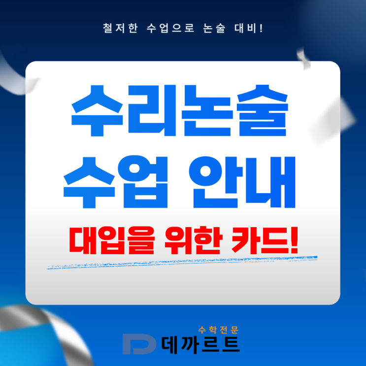 안녕하세요. 데까르트 수학학원입니다. 데까르트 수학학원에서는 매년 고3 학생을 대상으로 수리논술 수업을 진행하고 있습니다. ▲ ▲ 신규 상담 신청서▲ ▲ <수리 논술 수업 대상> - 수학 모의고사 3등급 이내 학생 - 정시 / 수능 전형을 준비 중인 학생 - 타 과목에 비해 수학 성적 및 실력이 높은 학생 <데까르트 수리 논술 수업 특징> <수리논술 개념 수업 진행> 수학 상, 하 / 수학1, 2 / 미적분 / 확률과 통계 / 기하 관련 수리논술에 필요한 개념 수업을 진행합니다. 과목별 기본 개념에 대한 강좌 또한 준비되어 있습니다. <개별 첨삭 및 피드백> 수리논술 모의고사를 진행한 후 해설 수업을 진행하며 학생별....... <img src="https://blogthumb.pstatic.net/MjAyNTEyMjBfMTM5/MDAxNzY2MjA0MDI0ODM5.mz725EAYsty_Brr0hWEmfs3V644Oy1BWBpBTHe-VrbIg.eoJc81dZcjEvL1asZCIYVFVByDG5_eTrLYSQvjYdde8g.PNG/001.png?type=s3" />