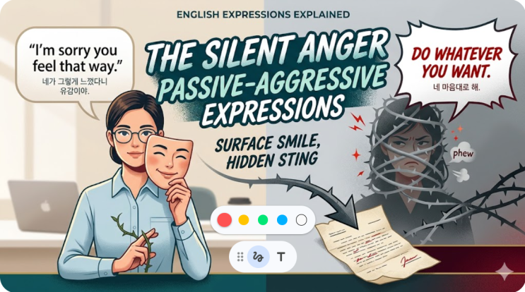 * '수동적 공격성(Passive-Aggressive) - 겉은 친절하지만 속은 날카로운, 'Passive-Aggressive' 표현 - 미드나 영화를 보다 보면 상대방의 태도를 두고 'Passive-aggressive'하다고 비난하는 장면이 나온다. 우리말로는 '수동적 공격성'이라고 하는데, 직설적으로 화를 내는 대신 은근슬쩍 상대방을 곤란하게 만들거나 기분 나쁘게 만드는 태도를 뜻한다. 1. '수동적(Passive)'인데 왜 '공격적(Aggressive)'일까? - 이 단어는 서로 반대되는 두 개념이 합쳐져 있다. 화가 났을 때 소리를 지르거나 물건을 던지는 것은 'Directly Aggressive(직설적 공격)'다. 반면, 'Pas....... <img src="https://blogthumb.pstatic.net/MjAyNjAzMjBfNjAg/MDAxNzczOTcyMDc5MTMx.jbK34mF-UmB5EO3YyJuEmr_qom3p1AWBoNiK7im7Efkg.CEODFB60womQAgXR12V2ZB4OBtqtp6Lzf49LWzst4o0g.PNG/image.png?type=s3" />