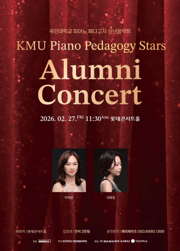 안녕하세요 아마빌레음악학원 원장님의 연주가 2월27일 오전11:30 롯데콘서트홀에서 있습니다^^ 국민대학교피아노페다고지 신년음악회로 국민대 동문들이 함께 연주를 합니다. 해마다 좋은 곳에서 연주할 수 있는 기회를 마련해 주시는 교수님께 감사드리며 많은 나이에 아직도 연주를 할 수 있음에 감사합니다 한번의 연주를 위해서는 많은 노력과 연습이 필요하고 힘들어요.. 하지만 우리 아이들 조금이라도 더 잘 가르치기 위해 실전감각을 잃지 않으려 꾸준히 연주활동을 하고 있으며 끊임없이 공부하며 노력하고 있답니다 연주관람을 원하시는 분은 문자로 신청해 주시면 초대권을 보내드려요! 문의 : 010 -8186 -6350 #운정아....... <img src="https://blogthumb.pstatic.net/MjAyNjAyMjJfMzAw/MDAxNzcxNzQ3ODAzNDQx.nbW9wnbjox9cf1b6UX3-uFNwX5kzh7PPCu95FKXd-60g.oNvKBZnxkC5UdPnVjVUAmg141Sped_R-VRvgu0eH-a4g.JPEG/900%A3%DFScreenshot%A3%DF20260127%A3%DF181016%A3%DFMobile_Print.jpg?type=s3" />