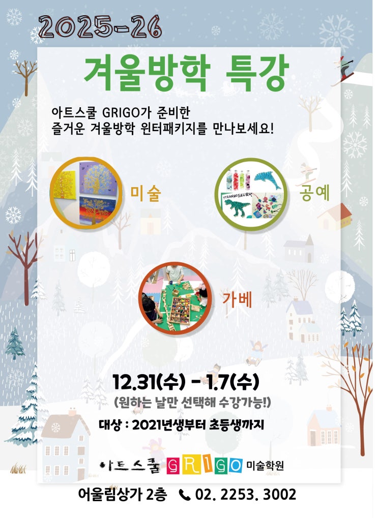 안녕하세요~ 건조하고 추운 겨울 건강하게 잘 보내고 계신가요~? 아트스쿨 GRIGO에서 야심차게 준비한 ‘겨울방학특강’을 소개합니다~! 이번 특강 구성은 미술 / 공예입니다. 아트스쿨 GRIGO의 특강 기간은 12월 31일(수)부터 1월 7일까지(수)입니다 (기간 중 원하는 날만 오전/오후 선택해 수강 가능합니다.) *원데이클래스 가능* 대상은 2021년생부터 초등생까지 친구들이에요! ******************************************************* 첫번째! 미술 수업 을 소개합니다~ 평면회화 수업은 다양한 재료와 기법으로 주어진 주제를 나만의 표현방법으로 그리는 시간입니다. 그림 기본기와 표현하는 실력도 늘고 관찰력도 좋아지는 아주 유익한....... <img src="https://blogthumb.pstatic.net/MjAyNTEyMjRfMjE1/MDAxNzY2NTA2NTg4MjQ5.P3WpipOxyMQcmMT3yWHhDXS1xCUrffUxR0hCsWmy3VIg.V5mKqY_7PzepnCw1bdTVrm3kl_sojgPwMjaMy7LrO8Eg.JPEG/2025-26%B0%DC%BF%EF%B9%E6%C7%D0%C6%AF%B0%AD%C6%F7%BD%BA%C5%CD.jpg?type=s3" />
