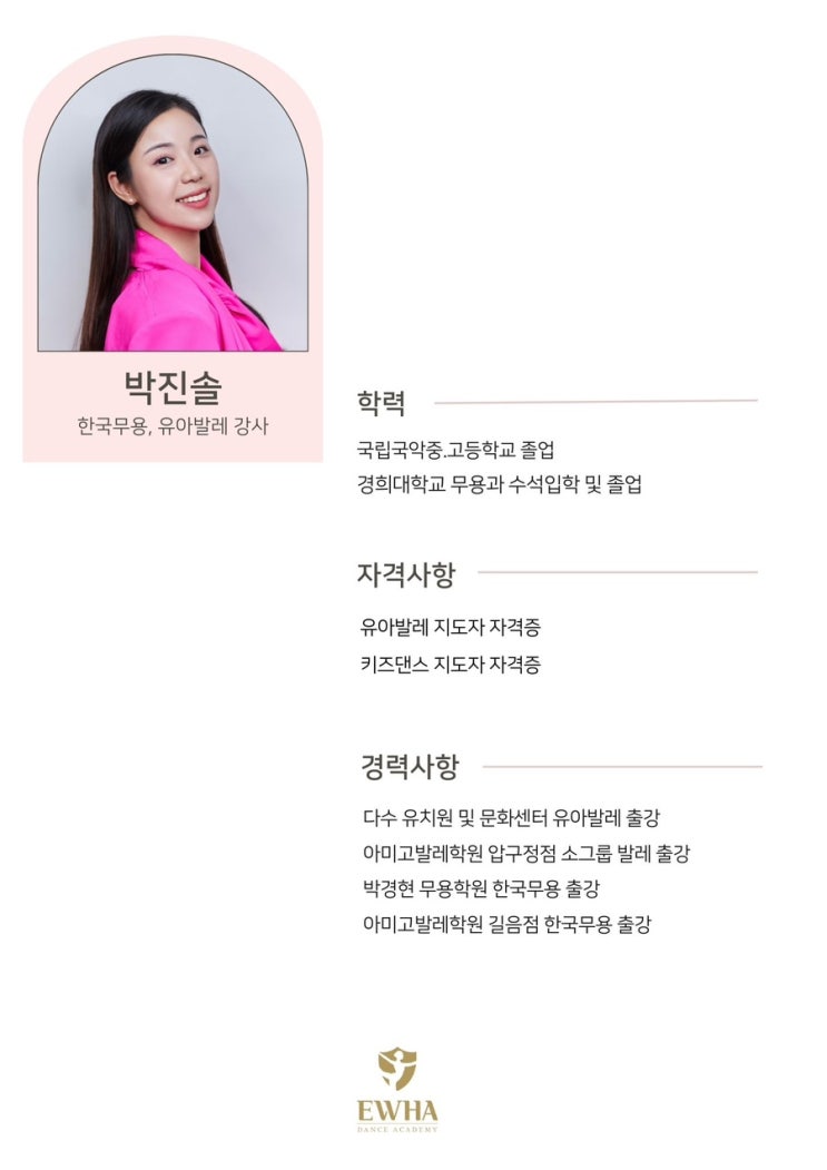 아이의 첫 무용을 함께하는 시간, 이화무용아카데미 박진솔 선생님 소개 박진솔 선생님 소개 아이들의 첫 무용 수업은 즐거움과 안정감이 가장 중요합니다. 박진솔 선생님은 한국무용 전공을 바탕으로 유아 발레와 키즈 수업을 오랫동안 지도해 온 선생님입니다. 기본기 위주의 수업 안에서 아이 눈높이에 맞춘 설명과 따뜻한 소통으로 처음 무용을 접하는 아이들도 자연스럽게 움직임에 익숙해질 수 있도록 돕고 있습니다. 다수의 유치원과 문화센터 출강 경험을 통해 연령별 발달 단계에 맞는 수업 진행이 가능하며, 놀이처럼 즐기면서도 바른 자세와 리듬감을 함께 키워 나갑니다. 무용이 처음인 아이부터 기초를 탄탄히 다지고 싶은 아....... <img src="https://blogthumb.pstatic.net/MjAyNTEyMjhfMTMz/MDAxNzY2ODgxOTAyNDI1.Ku8SrZxwZh-hegPJ3R1btbOO2-0q99A_EcDSwb2mGmAg.54bIW4VmnKRCNlcwPGyMKu_dFKgUuBG_32HJkRN1jY4g.JPEG/IMG%A3%DF4537.JPG?type=s3" />
