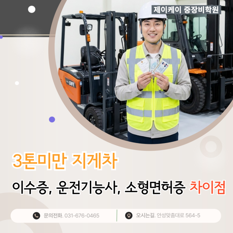 3톤미만 지게차 이수증, 운전기능사, 소형면허증 차이점은? 경기와 충청 지역에서 새로운 시작을 꿈꾸는 예비 수강생 여러분의 든든한 합격 파트너, 제이케이 중장비학원입니다! 아무래도 저희 학원에서 많은 수강생분들을 만나다보니 물류 현장에서 땀 흘리시는 분들을 보면 남일 같지 않고 더 싹싹하게 챙겨드리고 싶은 마음이 드는데요. 2026년 새해가 밝고 벌써 2월 중순이 지나가고 있네요. 요즘 평택이나 안성, 천안 등 경기 남부와 충청권의 물류 인프라가 워낙 커지다 보니 "지게차 하나 따두면 평생 먹고산다"는 말이 실감 납니다. 그런데 막상 시작하려고 검색해 보면 3톤미만 지게차 이수증, 지게차운전기능사 자격증, 소형....... <img src="https://blogthumb.pstatic.net/MjAyNjAyMjJfMTQ3/MDAxNzcxNzU1Mjg2NzUw.fED-SAcI5DzvqOOrvPiXkwuvzrq1CeUwXHWuZPlRvzYg.f2yvwlNqeDWJNnY5DaMMcSN2Bi9bq4N_QpJmUtFnJ-Ig.PNG/%28%BD%E6%B3%D7%C0%CF%293%C5%E6%B9%CC%B8%B8%26nbsp%3B%C1%F6%B0%D4%C2%F7%26nbsp%3B%C0%CC%BC%F6%C1%F5%2C%26nbsp%3B%BF%EE%C0%FC%B1%E2%B4%C9%BB%E7%2C%26nbsp%3B%BC%D2%C7%FC%B8%E9%C7%E3%C1%F5%26nbsp%3B%C2%F7%C0%CC%C1%A1%C0%BA.png?type=s3" />