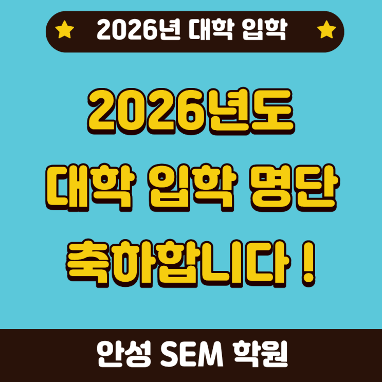 안녕하세요~^^ 안성 영어, 수학 전문학원 SEM 학원 "James" 선생님입니다! "SEM 2026년 졸업생" 대학 입학 명단을 공개합니다! 지난 시간 동안 묵묵히 자신의 자리를 지키며 포기하지 않고 달려온 우리 아이들이 소중한 결실을 맺게 되어 진심으로 자랑스럽고 기특합니다. 합격의 순간은 짧지만, 그 뒤에는 수많은 고민과 노력, 눈물과 인내의 시간이 있었습니다. 끝까지 버텨낸 여러분! 정말 고생 많았습니다. 그리고 진심으로 축하합니다! 26년 모든 신입생들에게 대학교 입학은 끝이 아니라 또 다른 시작입니다. 새로운 환경 속에서도 스스로를 믿고, 지금까지 해왔던 것처럼 성실하게 나아가길 바랍니다. 결과보다....... <img src="https://blogthumb.pstatic.net/MjAyNjAyMjRfMTI5/MDAxNzcxOTEzNDU3MzUw.u_Bn1QM1tbkSxszrmrTUsKMarzJlwsFWsLOVxTk-nA0g.JL93YH9Ygc0WPRiBOoTI-DdxK6yg_sk9mOgIC6uGwLIg.PNG/%C1%A6%B8%F1%C0%BB_%C0%D4%B7%C2%C7%D8%C1%D6%BC%BC%BF%E4._%2811%29.png?type=s3" />