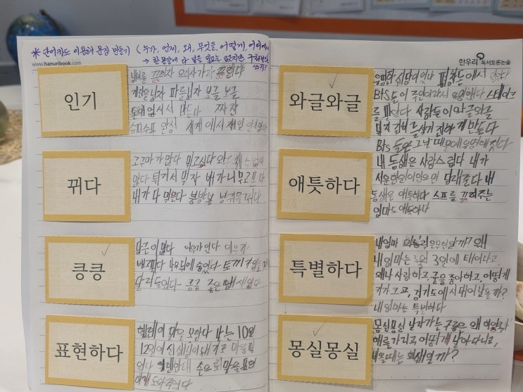 오늘은 정말 신통방통한 초등 1학년 친구를 소개합니다. 지난 늦가을 상담을 하러 엄마 손을 잡고 들어왔는데 제가 유치원생은 수업이 없다고 하니 "엄마, 그럼 나 못 하는 거야?" 하며 너무 서운해했어요. 너무 예쁜 이름 석자 잘 적어놓았다가 1학년 수업을 열었습니다. 똘망 똘망 한 눈을 반짝이며 알콩달콩 이야기를 해줍니다. 교사로서 이런 친구를 만나는 건 행운이라고 생각합니다. 지난 시간에는 카드를 노트에 붙여주고 문장 만들기 숙제를 내주었어요. 그런데 이런 아름다운 결과물을 가지고 왔네요~~ 시를 쓰고 싶었답니다. 이렇게 정성스러운 숙제를 보면 선생님은 마음이 설레죠. 그래서 만천하에 자랑합니다~~ @@아~~ 선....... <img src="https://blogthumb.pstatic.net/MjAyNjAzMTlfMjg4/MDAxNzczOTAxODI0NDYz.4IAgacNfN1b9akSR_72wN5ZBlzC5Win7o45-wXrbCuQg.C1s4YZQgfosfC_rWSt6QMa29aGjjeGIGBStc_lpH_3gg.JPEG/%C0%B1%BD%BD.jpg?type=s3" />