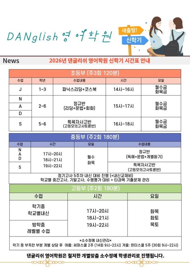 2026년 댄글리쉬영어학원 상반기 시간표
