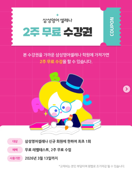2026 초등 영어, 삼성영어셀레나가 책임집니다. 삼성영어셀레나 2주 무료 수업 이벤트로 우리 아이만을 위한 맞춤형 영어 솔루션을 경험해 보세요! 신청 방법 1️⃣ 해당 게시물의 2주 무료 수강권 캡쳐 2️⃣ 가까운 삼성영어셀레나 학원 방문 3️⃣ 레벨테스트와 2주 무료 수업 받기 이벤트 혜택 1️⃣ AI 원어민 셀레나 선생님이 1:1 스피킹 테스트로 적정 레벨 추천 2️⃣ 정회원과 동일하게 정규 프로그램 2주 수강 ※ 유의사항 -학원별로 조기 마감될 수 있습니다. -교재비는 본인 부담입니다. <img src="https://blogthumb.pstatic.net/MjAyNjAyMTJfMjgz/MDAxNzcwODcyNjc2OTYz.pb4Qh-uJKcMvFeU6iVItLUpGAV6Q6JkFcbFKQ0bOx0Ug.tQfZpr663y6laML8sAlilHzuO_XjnRJ5je8nctiprSQg.PNG/image.png?type=s3" />