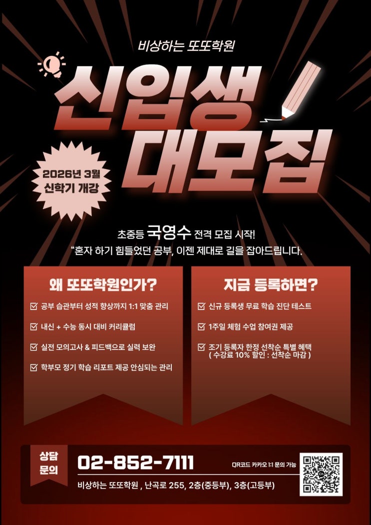 2026학년도 신학기 초등-중등-고등 국어-영어-수학 관악구 신림동일타학원 비상하는 또또학원에서 시작해보아요!