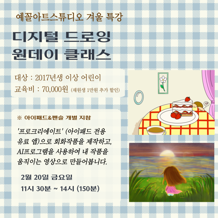 디지털 드로잉 대상 : 2017년생 이상 어린이 교육비 : 70,000원 *예꼴미술 재원생은 60,000원 수업 일시 : 2월 20일 금요일 11시 30분~14시 (150분) * 개인 아이패드 및 애플 팬슬 필요 디지털 드로잉을 기반으로 일상을 그리는 작가 헤일리 티프먼, 문도 멘도 등의 일러스트 작품을 감상하고, 나만의 일상 일러스트 작품으로 제작, 영상으로 확장하여 결과물을 만듭니다. '프로크리에이트' 기본, 기초 알기 ➔ 디지털 기반 일러스트 작가, 작품 감상 ➔ 작품 구상 및 제작 ➔ AI 프로그램 활용한 영상 제작 특강 수업 및 신청 관련하여 궁금하신 사항은 010 - 5805 - 6491 예꼴 대표 번호로 전화 또는 문자, 카톡 남겨....... <img src="https://blogthumb.pstatic.net/MjAyNjAyMTFfMjc0/MDAxNzcwNzgwODE5NzU4.SQeD9tMHrubTnVBCulUXtx0VtsIZCOFO0s0rzPeap80g.dQov-_rCnxJv7sx6uu81WPc7E681tELZsU_KrLp5hBYg.PNG/25%B0%DC%BF%EF%B9%E6%C7%D0%C6%AF%B0%AD_%C0%DA%C7%FD-006.png?type=s3" />