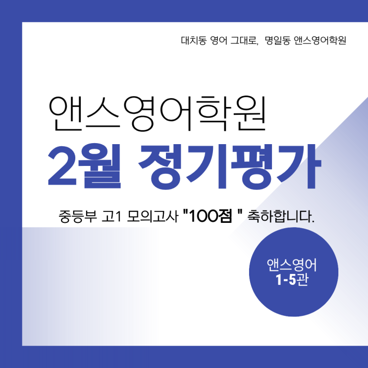 안녕하세요. 대치동 영어 그대로, 명일동 앤스영어학원입니다. 어느덧 2월의 마지막 주, 앤스영어는 3월 새 학기를 앞두고 학생 한 명 한 명의 학습 방향을 점검하는 정기 상담과 성적 분석으로 분주한 시간을 보내고 있습니다. 새 학기를 준비하는 중요한 시기인 만큼 결과를 확인하고, 부족한 부분은 보완하며 다음 단계로 도약하기 위한 계획을 세우는 바쁜 2월의 마지막 주를 보내고 있습니다. "결과는 우연이 아닙니다" 2월 정기평가 결과: 중등부 고1 모의고사 [100점] 배출! 단순한 내신 대비를 넘어, 고등 실전형 모의고사에서 거둔 이 성적은 앤스영어만의 '관리의 구조'가 만든 필연적인 결과입니다. ■입소....... <img src="https://blogthumb.pstatic.net/MjAyNjAyMjRfMTQz/MDAxNzcxOTI0MTEyMjky.9ovtoFRxBygFXfhKTeX-9cZXkTk3DC6IFfck_f_vobEg.d2Hrs3Wngq3CrU8jGThiLoe92p3uFBGUg1VqB4LcmpQg.PNG/1.png?type=s3" />