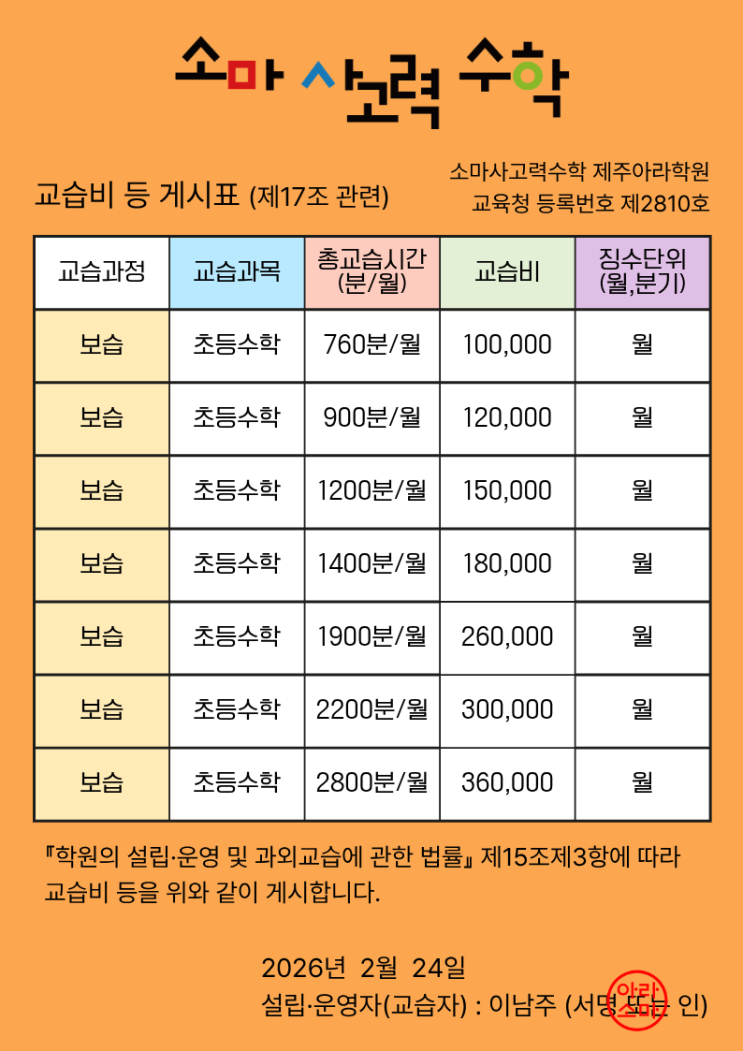 안녕하세요. 아이들의 수학적 사고를 키우는 소마사고력수학 제주아라학원입니다. 소마사고력 교습비를 안내드립니다. 본 학원은 「학원의 설립·운영 및 과외교습에 관한 법률」에 따라 교습비를 투명하게 공지합니다. 소마사고력의 교습비는 단순한 수업료가 아니라 아이의 사고력 기반을 세우는 과정에 대한 가치입니다. 문제를 빠르게 푸는 기술이 아니라 스스로 생각하고, 구조를 이해하며, 수학을 언어처럼 다룰 수 있는 힘을 기르는 수업입니다. 아라소마는 아이 한 명, 한 명의 현재 수준과 속도를 존중하며 단단한 기초 위에 사고의 깊이를 쌓아갑니다. 우리 아이의 수학적 성장, 지금이 시작입니다. 궁금한 점은 언제든 편하게 문의 주....... <img src="https://blogthumb.pstatic.net/MjAyNjAyMjVfMjEg/MDAxNzcxOTQ1OTQzNzA1.azWiXDHzWF87kdmmInYswG76qXEpa74QCY9kbylgsMAg.eCE6gqd-ihd9gctw7Da0bA0eEKsw17ZnXfCyJwlqs3Ig.PNG/%C1%A6%B8%F1%C0%BB%A3%DF%C0%D4%B7%C2%C7%D8%C1%D6%BC%BC%BF%E4.%A3%A821%A3%A9.png?type=s3" />