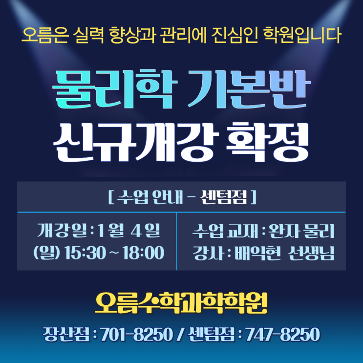 안녕하세요. 오름수학과학학원 원장 변은봉입니다.^^ 1월 오름 센텀점에서 개강하는 과학 신규 수업 안내드립니다. 수업에 대해 궁금한 점이 있으시면 학원으로 문의하여 주시기 바랍니다. 최고의 선생님들이 언제나 최선을 다해 지도하고 있습니다. ☎ 센텀 오름 : 051-747-8250, 010-6215-7506 ☎ 장산 오름 : 051-701-8250, 010-2282-7506 https://naver.me/Gq9Ychy4 https://naver.me/GnRHiDBH #화학 #생명과학 #물리학 #통합과학 #중등과학 #과학내신대비 #장산과학전문학원 #오름수학과학학원 #해운대과학전문학원 #좌동과학전문학원 #부산과학전문학원 #센텀과학전문학원 #우동과학전문학원 #중동과학전문학원 #자사고내신대비 #일반고내....... <img src="https://blogthumb.pstatic.net/MjAyNjAxMDFfMTc1/MDAxNzY3MjY2MTI3NTQ1.sBEjkK5wgeaP9OYhdytNRha27sXpSYQMBcVRd-cQ-xYg.m11J3S1rrp8QQ6vJWpUKIfTxwHuQLwaFbk0B54R3jzEg.PNG/%C1%A6%B8%F1%C0%BB_%C0%D4%B7%C2%C7%D8%C1%D6%BC%BC%BF%E4._%284%29.png?type=s3" />