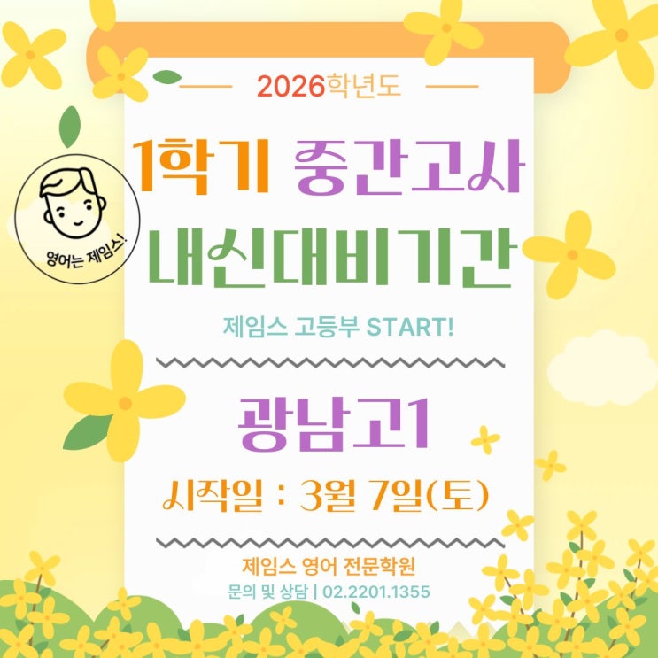 안녕하세요. 제임스 영어학원입니다~ 광남고등학교 1학년 1학기 중간고사 시작일 안내드립니다. 등록문의는 02 - 2201 - 1355로 연락 부탁드립니다. 감사합니다. <img src="https://blogthumb.pstatic.net/MjAyNjAzMDVfMTI0/MDAxNzcyNzE3MDk3ODU4.sclxKKe4d5lC04vkEOlYs1rDJ3rIpInHEai-pXsOdaQg.j3IlPA3fuI8BKxG2Qnab00-3e150HzTBQCpgo055yeEg.JPEG/1.jpg?type=s3" />