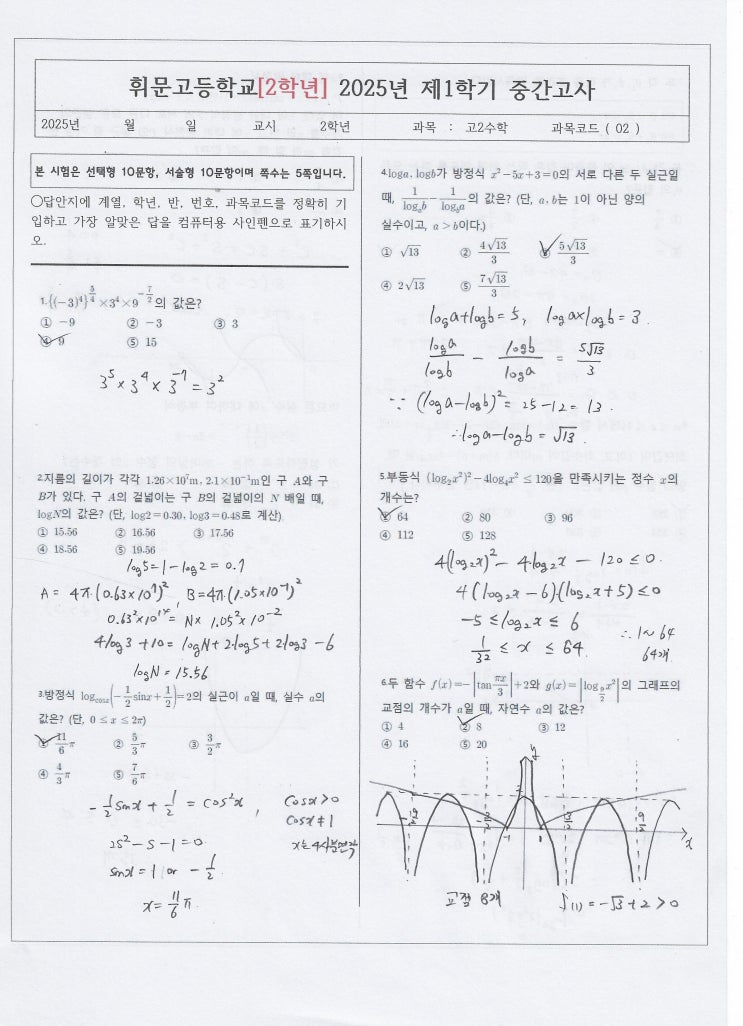 2025년 휘문고 2학년 1학기 중간고사 수학 기출 pdf 원본파일과 손풀이파일입니다. 범위 : 지수, 로그, 상용로그, 지수함수, 로그함수, 지수방정식, 지수부등식, 로그방정식, 로그부등식, 호도법, 삼각함수, 삼각함수 그래프, 삼각방정식, 삼각부등식 이웃추가 or 유튜브 구독~ 감사합니다 ^^ 열공하세요~ https://www.youtube.com/channel/UCXcTKNoCSfKPfgGRjRR80nA <img src="https://blogthumb.pstatic.net/MjAyNjAyMjZfMjUg/MDAxNzcyMDkzMzcyMDE2.3o6Ahg4JiGPIMXe-xS7J7K9GXN6HirmmXB4MsVhRN0Ag.qwpjzyO6Xyz63VA6CVa-9OVyFoWQs0LNV-oo0EWDLR4g.JPEG/%C8%D6%B9%AE%B0%ED_2025%B3%E2_2%C7%D0%B3%E2_1%C7%D0%B1%E2_%C1%DF%B0%A3%B0%ED%BB%E7_%BC%F6%C7%D01.jpg?type=s3" />