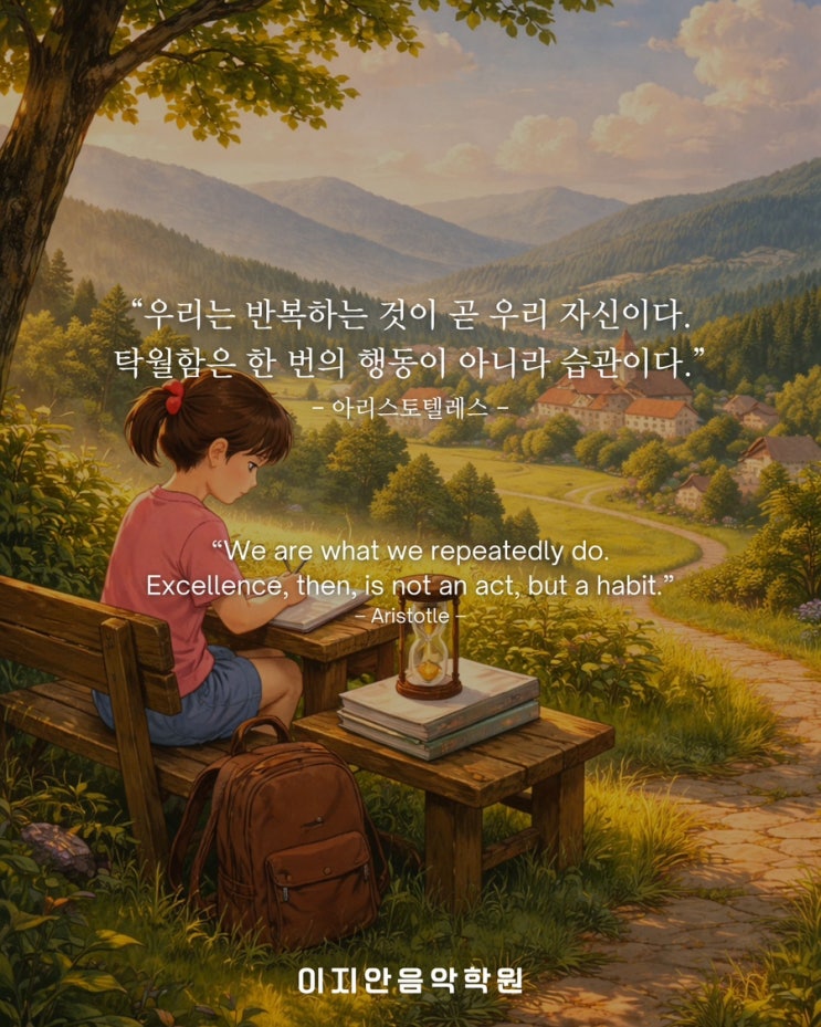 반복이 아이를 만듭니다. 아리스토텔레스는 말했습니다. 'We are what we repeatedly do. Excellence, then, is not an act, but a habit." 탁월함은 한 번의 성공이 아니라 반복에서 만들어진다고. 많은 부모님들은 '어떻게 하면 아이가 잘할까'를 고민합니다. 그러나 질문을 바꿔야 합니다. "우리 아이는 무엇을 반복하고 있는가?" 아이는 반복 속에서 정체성을 형성합니다. 매일 미루는 경험을 반복하면 "나는 원래 미루는 사람이야."가 되고, 매일 조금이라도 완주하는 경험을 반복하면 "나는 끝까지 해내는 사람이야."가 됩니다. 교육의 핵심은 지식을 많이 넣는 것이 아니라 반복의 방....... <img src="https://blogthumb.pstatic.net/MjAyNjAyMjFfMjYx/MDAxNzcxNjAxOTE1NTg2.5Q_OmxZU2GsSoClEI7MKtKdrfNuNuTCCzorVGojlKvUg.vd2JzzG6U7WoqfMvYZlFCI3DhGn4ydaPNZ1XecoumJAg.JPEG/IMG%A3%DF9095.JPG?type=s3" />